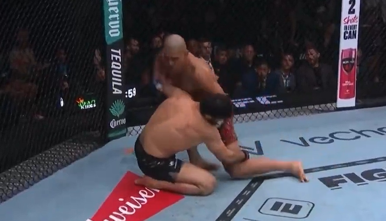 Pereira je pogodio strašan desni kroše, sjelo je to na sljepoočnicu dagestanskog borca i odmah je bilo jasno da je uzdrman. Pokušao je Ankalaev da se izvuče pokušajem rušenja, ali nije bilo šanse da to učini nakon ovakvog udarca i samo je Pereiri omogućio da dođe u poziciju za završetak meča.