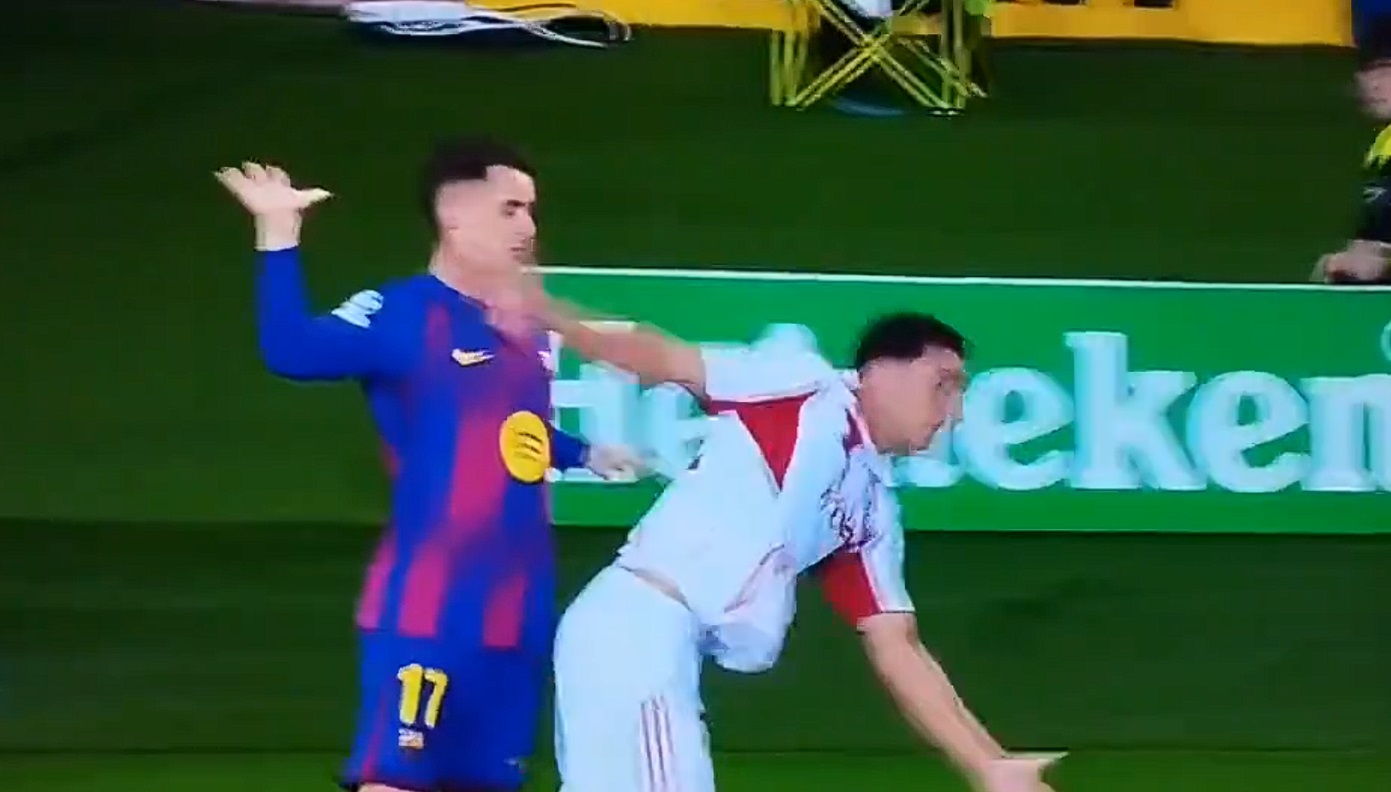 Casadó aplicando los #Valors de La Masía fingiendo una agresión en la cara de Hezze por rozarle con el dedo y 2° 🟨. Las ayudas de Ceferín a Laporta porque Olympiacos había recordado diferencias 😂🤣