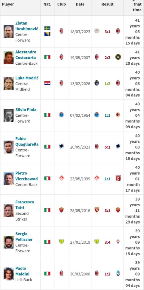 Jedina dva starija strijelca od Modrića su također bivši Milanovi igrači, Zlatan Ibrahimović i Alessandro Costacurta. Ibrahimović je posljednji gol u Serie A zabio kada je imao 41 godinu, pet mjeseci i 15 dana, a Costacurta kada je imao 41 godinu i 25 dana. To znači da Modrić ove sezone više ne može stići nijednog od njih dvojice.