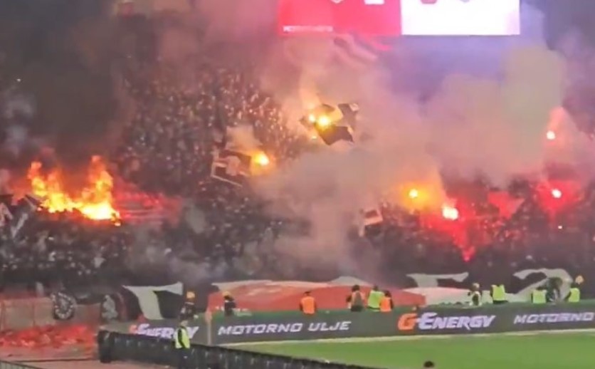 Nije ni čudo kada se zna šta se tu sve desilo. Već na samom startu meča navijači Crvene zvezde su sa vrha juga raširili zastavu sa transparentom koju su potom navijači Partizana zapalili. Videli smo i kako su sa juga odmah na početku utakmice kod jednog kornera poleteli topovski udari.
