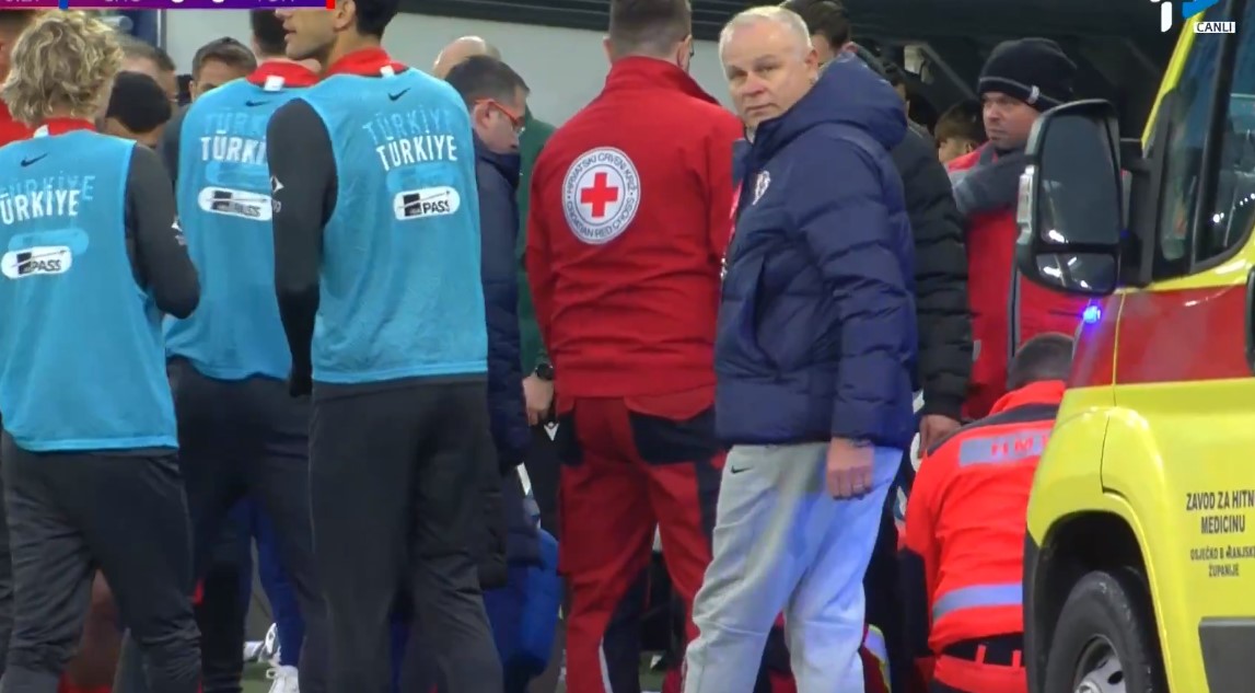 Upravo u tom trenutku izbornik Turske U-21 Egemen Korkmaz (43) srušio se na terenu. Igrači obje rerpezentacije su potrčali prema klupi kako bi pomogli, a uskoro je stigla i hitna pomoć.